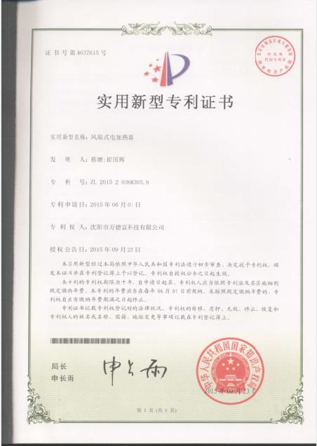 實用新型:風扇式電加熱器專利303.9片